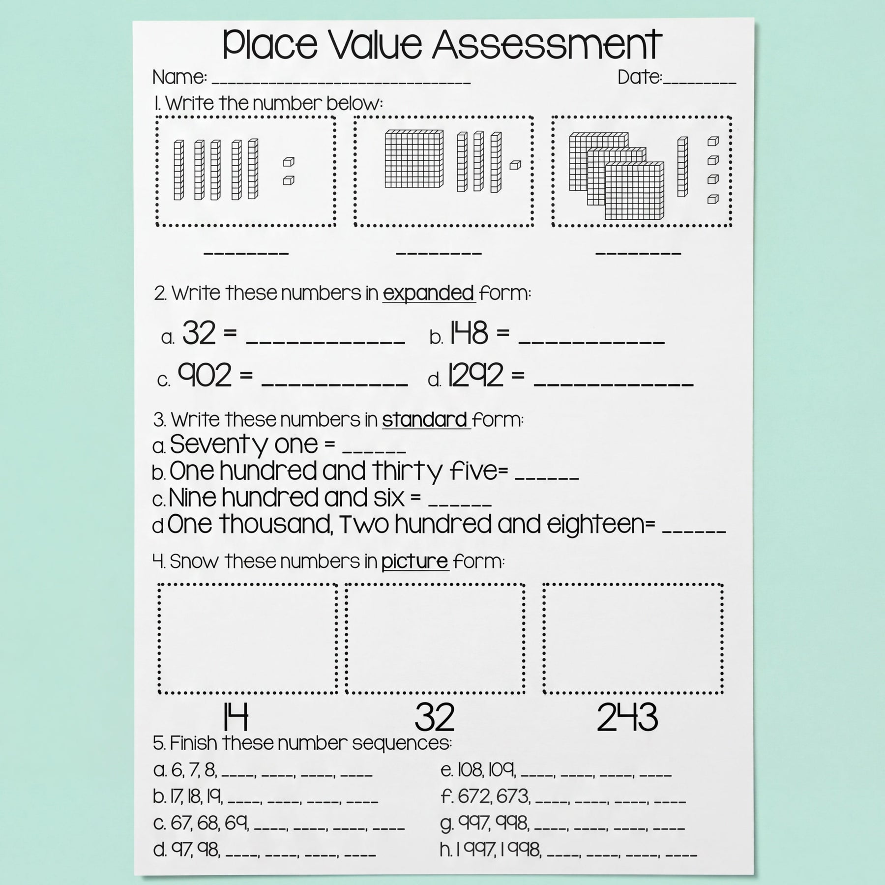 This assessment covers essential place value skills, including: